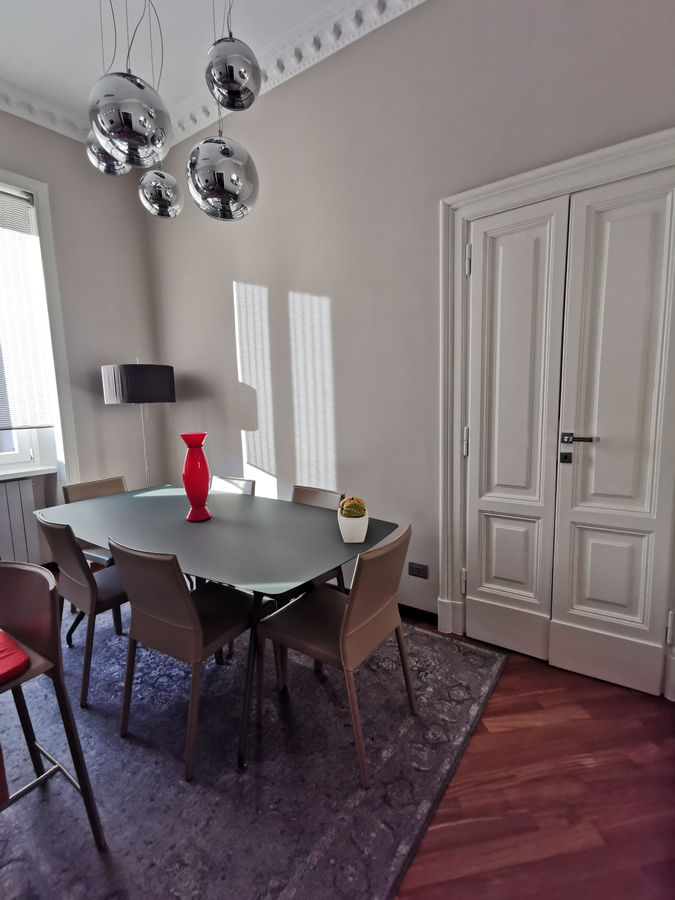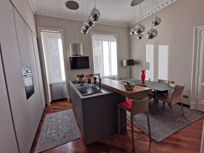 La cucina è stata ricavata dall'unione di due ambienti: il bagno (molto stretto secondo gli usi dell'epoca) e una camera. Si crea così un ambiente unico che comprende la cucina con isola, provvista di piano snack per uno spuntino veloce o per la colazione, e un comodo tavolo da pranzo.